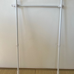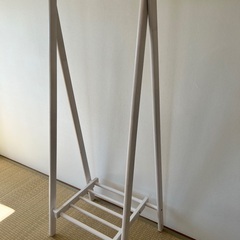 白の木目調のハンガーラックです。中古品のため近づいてよく見ると傷・汚れがありますが、パッと見目立ちません。