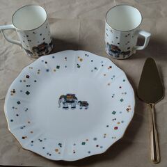 象柄に金のラインが入ったマグカップ2客、大皿とケーキサーバーのセットです。(大皿サイズ :直径27cm)