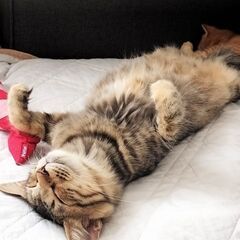 大きな物音や周囲の変化も気にせずお腹を出して寝てるタイプで非常に飼いやすい子だと思います。