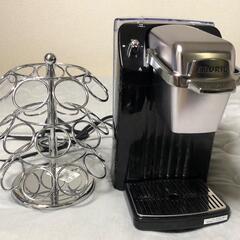 コーヒー抽出マシンKEURIG(キューリグ)の本体と、コーヒーが入っているカプセル(K-Cup)を綺麗にならべておけるKカップツリー(くるくる回ります)のセットです。