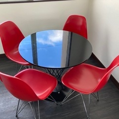 黒の光沢感のある丸テーブルと赤い椅子