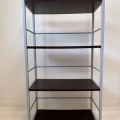 金属フレームと木の板の収納棚。