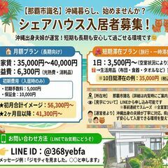 はじめまして! 私たちはアットホームなシェアハウスを夫婦で運営しています。 もともと「一人でも安心して暮らせる場所を提供したい」という想いから、2020年にこのシェアハウスをスタートしました。 地元沖縄を愛し、人とのつながりを大切にしている私たちが、県内外から来られる方々を心を込めてサポートしています。 🌿 シンプルだけど、落ち着ける空間 🌿 無理なく、安心して暮らせる料金設定 🌿 必要なものはすべて完備。手ぶらで入居OK! お部屋はすべて個室で、生活スタイルを尊重しながら、 必要なときには入居者さん同士が自然と交流できる、そんな"ちょうどよい距離感"を大切にしています。 見学だけでも大歓迎です! ご興味がある方は、ぜひ一度お気軽にご連絡ください😊