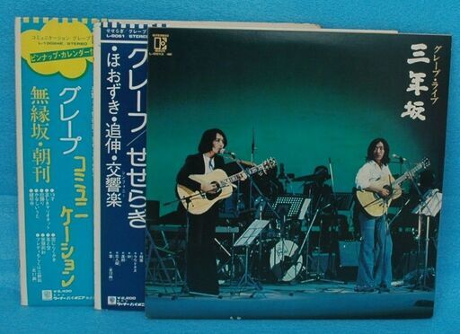 グレープ中古・直径30cm LP盤アナログ・レコード 計4枚CDではありません。黒いビニール円盤ですのでご注意ください。◎アルバム名(年代順不同)三年坂(ライブ 2枚組)せせらぎコミュニケーション※若い方はご存知ないかもしれませんが,2人組のグレープを解散して単独になったのが現「さだまさし」です。****以下はレコードの共通事項****水洗したうえで,ヘッドフォンで試聴しています。中古なので劣化はありますが,良盤のほうです。ジャケットには傷み,汚れ,落書き,整理用ラベルがあります。歌詞カードを管理用に抜き取っているものがあります。発売時にはポスターなどがあっても,付属しません。佐賀市大和町の「イオンモール佐賀大和」で手渡し希望です。屋上の赤い「AEON」看板下の入口内側でお待ちいたします。ご都合のいい日時をお知らせください。宅配便での発送は事情によりできません。お金を頂戴するのはいやなので,不要品どうしの物物交換を希望します。お宅の大掃除ででてきた食品やタオルでも頂戴できれば嬉しいですが,物が残る食器などは私も持て余します。レコードはものによって中古市場で値がばらばらですが,1枚200円見当で交換品をお選びいただけるといいと思います。最初にご連絡いただいた方にお譲りいたします。私がログインしないうちに多数のご連絡をいただいていることがありますが,すみませんが先着順とさせてください。よろしくお願いいたします。