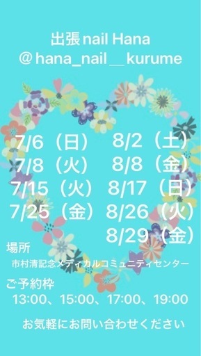 佐賀みやき町市村清記念メディカルコミュニティセンター1Fジェルネイル💅耳つぼジュエリー💎どちらもご予約受付中です。7/8(火)13:00 15:007/15(火)13:00 15:008/2(土) 10:00 12:008/8(金)13:00 15:00 17:00 19:008/17(日)10:00 12:00 14:008/19(火)11:00 13:00 14:308/26(火)13:00 15:008/29(金)13:00 15:00 17:00 9/11(木)13:00 15:00どちらもお気軽にお問い合わせください。
