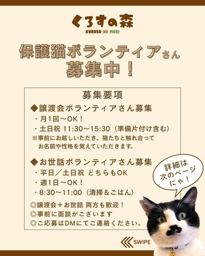 猫たちのしあわせのために、私たちと一緒に活動してみませんか?🧡 譲渡会ボランティアさん 募集中!くろすの森では、毎月およそ3回ほど譲渡会を開催します。ご参加は【月1回から】でも大歓迎✨📅開催:土日祝日🕰時間:11:30〜15:30(準備・片付け含む)まずは会場の設営や誘導などのサポートから、慣れてきたら、里親希望の方のご案内もお任せします◎※猫たちの性格や特徴を知っていただくための事前見学があります。💚 お世話ボランティアさん も募集中!猫たちの毎日を支えてくださる方を探しています🐾🧹主な内容:清掃やごはんの準備など📅平日・土日祝どちらでもOK🕰時間:8:30〜11:00の朝の時間帯ご都合に合わせて【週1日〜】のご参加で大丈夫です◎「お掃除好き」「猫のために何かしたい」そんなお気持ちだけで大歓迎です✨✨ 譲渡会+お世話、両方ご参加も大歓迎!✨ 事前に面談があります✨ ご応募・ご質問はお気軽にお問合せ下さい♪✨ 活動内容は画像4枚目からSNSをチェックしてください👀❣“ちょっと気になる…”そんな気持ちでも大歓迎です!ご連絡、お待ちしております🐈🌼