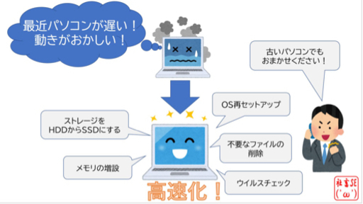 最近パソコン遅いなぁ、古いパソコンだけどまだ買い替えしたくないなぁ使いたいのに動きが悪いなぁ(つω`)DVD見ようと思ったら、映らない!Windowsアップデートしたら調子が悪い!こんなときはメンテナンスしましょう!パソコンの修理承ります!お気軽にお問い合わせください⭐︎お見積りだけでも、ご連絡ください!①パソコンを新規で欲しい方②お使いのパソコンが不調の方③パソコンを処分したい方④パソコン周辺機器についてお悩みの方⑤ネットに繋げたい、無線にしたい方⑥その他、なにかお困りの方