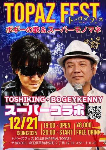 🎤 TOSHIKING スーパーものまねライブ開催!🎶✨ 驚異のクオリティ!TOSHIKINGのものまねライブで大爆笑&感動の夜を! 🎭🎶📅 2025年12月21日 (日)🕖 19:00 オープン / 20:00 スタート📍 CLUB IMPERIAL TOPAZ【TOPAZ FEST.】🚆 獨協大学前駅 東口 徒歩3分🎟 料金:¥8,000(フリードリンク制)※シャンパン・ワインボトルは別途料金※現金のみのお支払いとなります🎟 予約可:出演者またはお店にてご予約をお願いいたします💥 笑いと驚きのエンターテイメント!圧巻のステージをお見逃しなく!最高の夜を一緒に楽しみましょう!✨ https://www.topazfest.com/event/1405