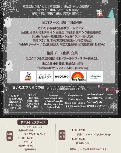 第17回となりました。\10月5日(日)は、浦和駅東口市民広場へ!/「手をつなごう市民活動 夢マルシェ」には市民活動団体、福祉団体、つくりてたちが大集合✨🟠市民活動・福祉団体ブースA:さいたまつくりての輪(主催)B:さいたま市市民活動サポートセンターC:さいたま市D:埼玉デザイン協議会E:WishサポーターF:前地つきいちG:埼玉骨髄バンク協会H:atelier NagiI:クルド文化教室J:いちご福祉会🧶つくりての輪・てしごと出店者ブース1:木工房Studio Char2:パユーン3:ミモザ4:leola_one_yukko5:Q's club6:*happiness*7:colors of peru8:さくらんぼ9:Wirecraft*Wireart Le Coeur Ensemble10:Healing place Sao11:Oscarica12:kalra13:環 TAMAKI14:MLcraft15:エトワールソレイユ16:Itoneko17:コグマ工房ステージは フラダンスカイレオ、ギター教室 ギターレ、殺陣IMON📣約30ブースが出展予定✨ワークショップ・ハンドメイド販売・PR・交流など子どもから大人まで、楽しめる1日です!🗓2025年10月5日(日)10:00〜16:00📍浦和駅東口市民広場#夢マルシェ #市民活動 #福祉団体 #さいたま市 #ハンドメイド販売 #ワークショップイベント #地域とつながる #つくりての輪 #浦和イベント #出店者紹介