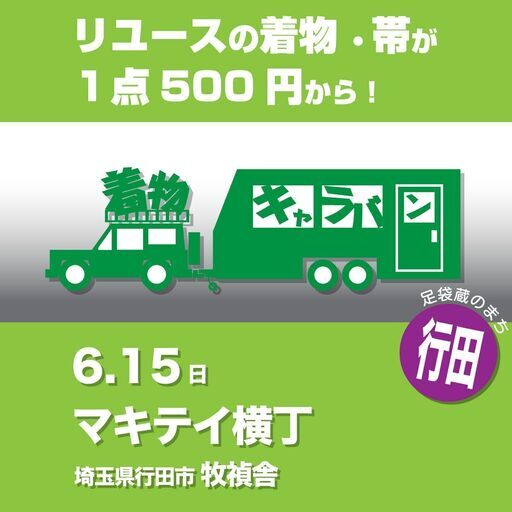 着物の移動販売「着物キャラバン」です。行田の牧禎舎で年2回(2月と6月)開催されるイベント「マキテイ横丁」に参加します!日時 6/15(日)場所 牧禎舎交通 秩父鉄道 行田市駅から徒歩5分着物キャラバンで販売するリユース(古着)の着物や帯は、・洗濯はしていません。・素材はわかりません。・現状のままの販売です。・汚れ、あります。 穴が空いているとかは、 極力避けますが、 見落としがあるかもしれません。お買い物は、・ノークレーム、ノーリターン・買い物袋はご持参ください。・沢山お持ちする予定ですので、 サイズは測っていませんので 要“メジャー持参”です。・お支払いは現金のみです。 小銭をご用意いただくと 大変助かります☺️・名簿を取ったり、 催事販売への勧誘はしません。ホームページ https://sites.google.com/view/kimonocaravan/