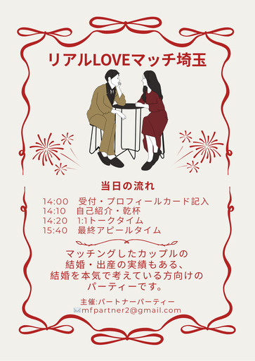 これまで都内で開催していた人気の【リアルLOVEマッチ】が埼玉で初開催!!マッチングしたカップルの結婚・出産の実績もある、結婚を本気で考えている方向けのパーティーです。【イベント内容】全員と話せる1:1トーク中心。プロフィールカードを見ながら話せるので話題にも困りません。地元トークや趣味の話、好きな食べ物etc.で盛り上がりましょう!個室なので、周りのお客様を気にすることもありません。■開催日時2026年4月12日 14:00■会場:カラオケトレビ埼玉県所沢市松葉町11-13西武新宿線/新所沢駅から徒歩1分東口の階段を下り、ロータリーの前方に7階建ての白いビル(1階がセブンイレブン)が見ます。その右隣りのビル(1階がパン屋さん)の4階になります。ビル左側のエレベーターで直接4階にお越しください。■参加条件独身・対象年齢であること女性:21〜39歳会費:1,000円男性:25〜39歳会費:5.000円■最小催行人数男女4:4■中止判断タイミング前々日の21時までに最小催行人数に満たない場合は、中止とさせていただきます。■飲食飲み物(アルコール有)・お茶菓子付き■主催:パートナーパーティー