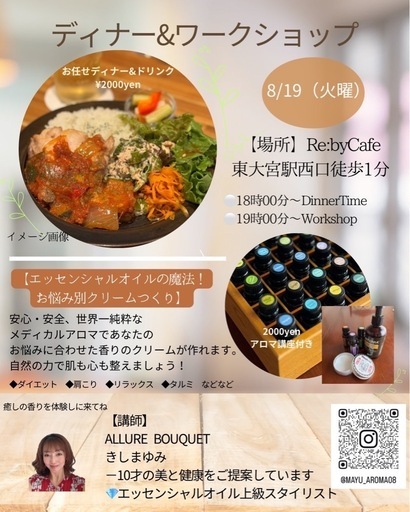東大宮駅西口 徒歩1分Re: byCafe さんで有意義な時間を過ごしませんか?お食事の後アロマワークショップをやります!100%オーガニック世界一純粋と言われているメディカルアロマを使ってお悩み別のアロマクリームをお作りいただきます。・ダイエット・美肌・肩こり・アレルギーなどなど◆18時00分〜カフェオーナーのおススメディナー&お飲み物¥200019時00分〜◆アロマワークショップ¥2000体に優しい食事と香りに癒されて心身共に整う事間違いナシです。どなた様でも参加できます。おひとり様、男性の方大歓迎です!ご予約制です。お電話かメッセージください。アリュールブーケット−10才の美と健康をご提案きしまゆみ