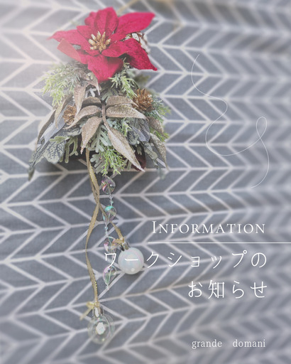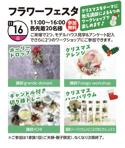 グランデドマーニの小川です。久喜住宅展示場でのワークショップのご案内です。受講料は無料。自分で作った作品をご自宅に飾ってみませんか!お気軽にお越しくださいませ!▽2025/11/8更新ご予約を想定以上いただきましたので、いったん締め切らせていただきます。■□■□■□■□■□■□【WS開催ご案内】フラワーフェス「ホーリードロップ」ワークショップ11月16日(日)久喜住宅公園11:00-16:00埼玉県久喜市本町6-14-16ポインセチアときらめくリーフをあしらった、エレガントな吊るすタイプのクリスマスアレンジ。ゆらゆらと揺れるオーロラ色のドロップが可愛く、美しくクリスマスを彩ります。 作品サイズ:全長約25センチグルーガンを使ってお花を留める作業を行いますできれば汚れても良い服装でお越しください■□■□■□■□■□■□<ご予約(現在中止)>数に限りがあるため、ご予約がおススメです。公式LINE(お問い合わせは可能) https://lin.ee/4oeuzY9お申し込みフォーム(現在使用不可) https://x.gd/4VH0q__________<ご予約特典>ご来場で1組当たりワークショップを2回体験(違うコンテンツでも同じコンテンツでもOKあくまでお客様は体験無料です!) さらに!モデルハウス見学&アンケート記入すると2回ワークショップご参加できます▼ご予約ありがとうございました。準備数を超えそうなため予約は終了しました。〇空きアリ、△残り僅か、🈵満席11:00 🈵11:30 🈵12:00 🈵12:30 🈵13:00-14:00休憩につき一旦クローズ14:00 △14:30 △15:00 △__________作品画像など詳細はブログをご覧ください https://ameblo.jp/ogawagon/entry-12936216839.html__________<制作所要時間> 約30分<ご予約特典>開催日前日までにご予約の上、当日ご来場いただきますと当日住宅公園で開催されるワークショップに使えるチケットをお渡しいたします*お子様のみのご予約はできません。お子様が参加される場合でも保護者の方のお名前をいただきますので、ご承知おきくださいませ。*ご予約後、ご来場の際に身分証明書の提示が必要になりました。免許証、健康保険証のほか、他社ポイントカードなどお名前が確認できるものをお持ちください。*当日会場では複数ワークショップが開催されます。ご予約はいずれか1つのみとなります。*キャンセルされる場合はグランデドマーニ担当講師までご連絡ください。住宅展示場では問い合わせ、ご予約、キャンセルの対応はしておりません。*午前は屋内、午後は屋外でのワークショップとなります。■□■□■□■□■□■□#久喜住宅公園