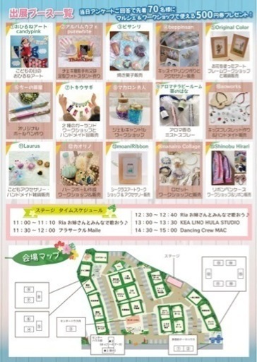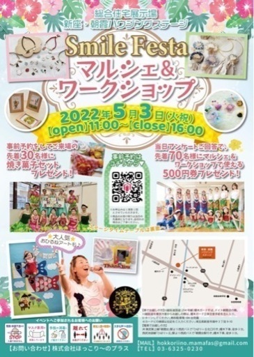 0歳の赤ちゃんから大人まで楽しめるワークショップや販売、フラやキッズダンスのステージなど盛りだくさんのイベントです。事前予約してくださった先着30名様にピサンリさんの焼き菓子セットをプレゼント!そして当日『ママのバLINE登録』をしてくださった方、先着70名様(各ブース先着5名様)にマルシェ&ワークショップで使える500円分のお買い物券をプレゼントいたします!(受付にて配布します)ぜひご家族やお友達と遊びにいらしてくださいね♪【Smile Festaマルシェ&ワークショップ】日時 2022年5月3日(火・祝)11:00〜16:00場所 新座朝霞ハウジングステージ(詳細はチラシを参照)《出展者様》1.こどもの日のおひるねアート2.チェキ撮影手形または足型フォトスタンド作り3.ピサンリ焼き菓子販売4.キッズイヤリング作りとアクセサリー販売5.お花を使ったアートフレームワークショップと雑貨販売6.オリジナルボールペンづくり7.2種のガーランド(車とこいのぼり)ワークショップとハンドメイド品販売8.ジェルキャンドルワークショップ9.アロマ香るミストスプレー10.キッズブレスレット作り&ハンドメイド販売11.こどもアクセサリー・ハンドメイド雑貨販売12.ハーブボール作成ワークショップ&販売13.シーグラスアートワークショップ&アクセサリー販売14.ロゼットワークショップと販売15.リボンペンケースワークショップ&リボン販売【ステージ出演者様】11:00〜11:10 Riaお姉さんと歌おう♪11:30〜12:00 フラサークルMaile @ami_maile888 12:30〜12:40 Riaお姉さんと歌おう♪13:00〜13:30 KEA LINO HULA STUDIO14:30〜15:00 Dancing Crew MAC皆様のご来場を心よりお待ちしております😊 https://ameblo.jp/cinderellaaa35/entry-12739695682.html