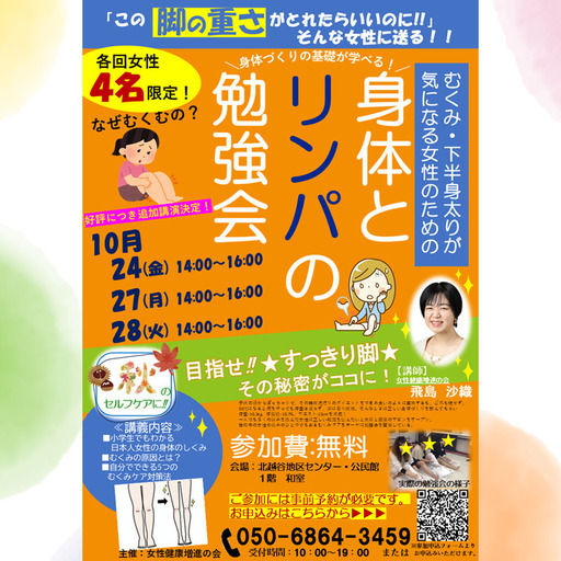 🖊脚のむくみが取れたらいいのに!そんな女性に送る📖『身体とリンパの勉強会(無料)』 を開催します‼️✅夕方になると脚がパンパン…✅靴が履きづらい…✅脚が辛い、重だるい…などなど心当たりありませんか?女性の身体の悩みに多い「むくみ」についてレクチャーします!!!!楽しく学んで目指せ!スッキリ美脚✨無料で勉強できます❗【各回4名(女性限定)】☘️開催日時 10月24日(金) 14時〜16時 10月27日(月) 14時〜16時 10月28日(火) 14時〜16時☘️主催女性健康増進の会~女性健康増進の会について~忙しい現代女性でもすぐに実践できる、健康に関する幅広い情報を伝え、より多くの女性が今よりも女性らしくハツラツとした生活を送っていただくことを目的とした、女性のための女性による会です。定期的に各種イベントや勉強会を開催しており今回は好評の『身体とリンパの勉強会』を越谷市の会場にて開催します。☘️会場 北越谷地区センター・公民館 1階和室 東武スカイツリーライン「北越谷」駅 西口より徒歩5分 ※駐車場あり☘️参加費 無料お一人での参加はもちろん、母娘・姉妹・ご友人などお誘い合わせのうえ、お気軽にお申込みください!貴女のご参加をお待ちしております。▼お申込みはこちらから▼ 📞050-6864-3459または、🌐 https://ssl.form-mailer.jp/fms/d3d24f86836755#リンパ#リンパマッサージ#むくみ#むくみ改善#冷え#冷え性改善#ダイエット#足痩せ#脚痩せ#セルフケア#セルフマッサージ#美容#健康#女性健康増進の会#越谷#北越谷