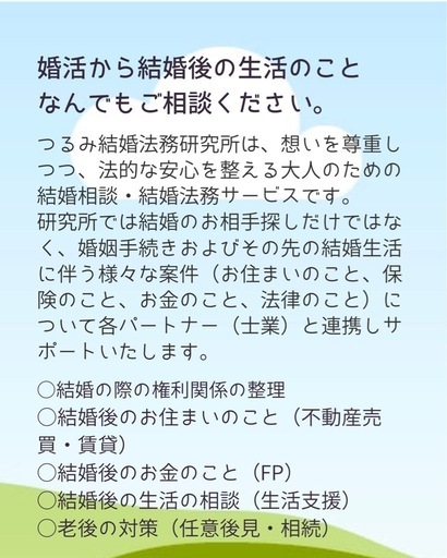 \3月末ご入会まで入会金0円/2026年3月6日つるみ結婚法務研究所 サービス開始法律家が運営する安心の結婚相談所です。✔ 本気で結婚を考えている方✔ 再婚・中高年婚・将来不安のある方✔ 一人の老後に不安を感じている方孤独死や9060問題などの社会課題にも向き合い、“出会い”だけでなく“その後の人生設計”まで伴走します。結婚相手の検索(仲人型サポート)から、法律・住まい・お金の不安までご相談可能です。【埼玉県新座市発/全国対応】対面・オンライン面談可※出張面談は交通費実費📩 まずは無料相談からどうぞ限定キャンペーンは3月末まで。ご相談も無料になります。お気軽にメッセージにてお問合せください。つるみ結婚法務研究所埼玉県新座市野火止五丁目2-43(新座駅徒歩3分) https://akiosky02646.my.canva.site/web/法務手続きの提携先つるみ行政書士事務所 https://akiosky02646.my.canva.site/administrative-sorivener-office
