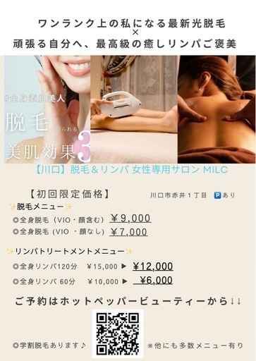 川口市で自宅サロンをしているMILCです♪完全予約制・女性専用のプライベートサロンで、脱毛やリンパケアを中心に施術を行っています。周りを気にせず、リラックスして過ごしていただける空間を大切にしています。そして、当サロンに細部まで見逃さないスポットアタッチメントを導入いたしました!お店のご案内として投稿していますので、ご興味のある方はお気軽にメッセージください。場所やメニューの詳細は、メッセージにてお伝えします。