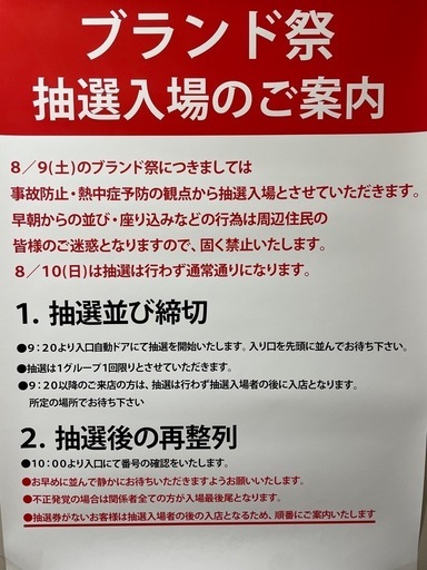 8/9(土)〜8/10(日)店内特設コーナーにて、メンズ古着やカバン・クツ・雑貨類を中心にブランド商品約3000点を一挙大放出します!毎回人気のイベントですので、お楽しみに♪8/9のみ入店方法が通常と異なりますので、ご注意下さい