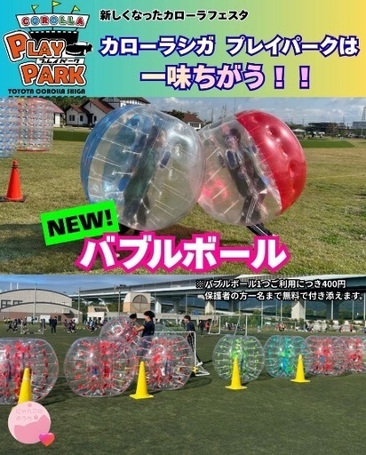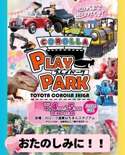 4/4(土)4/5(日)カローラシガ プレイパーク 2015年より開催し、地域の皆さまと大切作り上げてきたカローラフェスタは10回目の開催を節目に大幅リニューアル! 新たなイベント「カローラシガ プレイパーク」として生まれ変わります!! 会場は、2025年4月にリニューアルし、トヨタカローラ滋賀がネーミングライツパートナーとなった <<カローラ滋賀はちまんスタジアム>>です。 楽しさはそのまま、「遊ぶ」「学ぶ」「動く」「交通安全」など、様々なテーマを元に クルマだけにとどまらないモビリティの魅力や、最新のコンテンツをギュッと詰めこみバージョンアップした屋外イベントとして 2026年4月4日(土)・5日(日)に開催が決定しました!毎回恒例の模擬店やキッチンカーも出店致します♬【日程】 2026年4月4日(土)・5日(日) 10:00~17:00 【会場】 カローラ滋賀はちまんスタジアム 〒523-0086 滋賀県近江八幡市津田町18 ※入場料無料。一部コンテンツは有料となります。