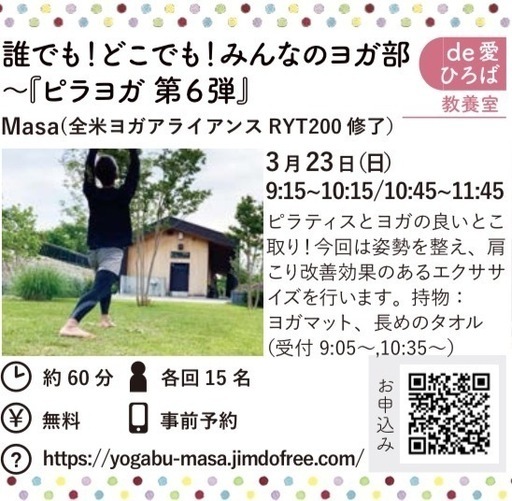 『誰でも!どこでも!みんなのヨガ部』誰でもどこでも、皆んなが気軽に自分のペースでヨガを楽しめる活動です。草津川跡地公園の市民活動「くさねっこ」にて、週末、月一回開催しています。ヨガ好きな人はもちろん、未経験の人、男性、シニア、体力に自身の無い人、身体の硬い人、お子様連れ、、、誰でも大歓迎!気持ち良い季節は芝生の上で、暑い季節、寒い季節、雨の日は屋内で。第21回目の今回は先月に続いてヨガとピラティスを組み合わせた『ピラヨガ』の第6弾!ピラティスとヨガそれぞれの良いとこ取りをした、ちょっと欲張りなプログラムです。 テーマは、「肩こり改善エクササイズ」! 第5弾ではピラティスの正しい姿勢や身体の動かし方の習得を中心に行った後に、肩こり改善メニューをちょっとだけ紹介しましたが、今回はより本格的に、姿勢を整え肩こり改善に効果のあるエクササイズにチャレンジしていきます!前回参加出来なかった方も、要所要所で基本の復習をしながら進めていきますので安心してご参加ください! 今回も教養室での屋内ヨガ。空調の効いた快適な室内でピラティスとヨガを楽しみましょう! ○ 日時:2025年3月23日(日) ①9:15~10:15(受付開始は9:05~) ②10:45~11:45(受付開始は9:35~)○場所:草津川跡地公園 de愛ひろば 活動棟内教養室○参加費:無料○持ち物:ヨガマット、長めのタオル、水分 ※ヨガマットをお持ちでない方は、数に限りがありますがお貸しできる場合もありますので事前にご相談下さい。○定員:各15名⭐︎予約・連絡・お問い合わせはコチラのLINE公式アカウントから。クリックで友だち追加できます。 ↓↓↓↓↓ https://lin.ee/bQa6zB7 その他詳細はこちらより。 ↓↓↓↓↓ https://yogabu-masa.jimdofree.com○部長(主宰者):Masa【所有資格】・全米ヨガアライアンスRYT200認定トレーニング修了・PHI Pilates MatⅠ&Ⅱ インストラクター・NSCA- CPT(全米ストレングス&コンディショニング協会公認パーソナルトレーナー)・ジョギングインストラクター2級(ADVANCE)(日本ライフタイムスポーツ協会認定)#ヨガ #くさねっこ #草津川跡地公園 #de愛ひろば #旧草津川 #草津市 #滋賀県 #ピラティス #ピラヨガ #ヨガイベント #ヨガ教室