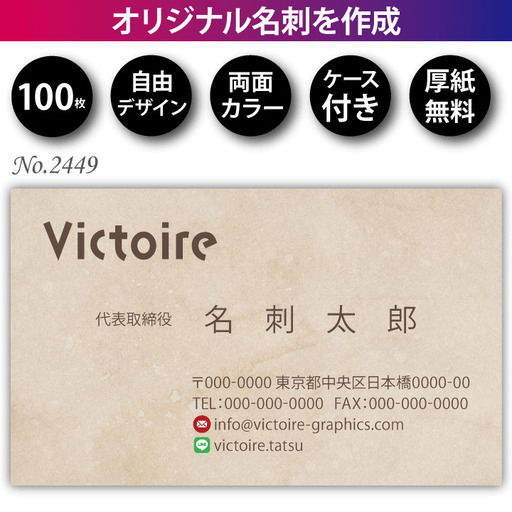 ■価格:1,480円■枚数:100枚■名刺サイズ:55mmx91mm■両面フルカラー印刷■用紙と厚みは以下からお選び下さい。①光沢あり、厚さ普通②光沢あり、厚め③光沢なし、厚さ普通④光沢なし、厚め■デザインNo.2449※ 裏面もフルカラー印刷が可能です。※ 納期はデザイン確定後1週間程度でお考え下さい。※ 紙ケース付きです。※ 印刷は大手印刷会社にて行います。※ 送料(ネコポス)は無料です。※ ご質問などございましたら、住所欄にメールを記載しております。※ 他のデザインは、ネット検索のグーグルで『販売支援のヴィクトワール』で検索して下さい。#名刺#名刺作成#名刺印刷#格安#作成#デザイン#ポイントカード#スタンプカード#ショップカード#おしゃれ#安い#ペット名刺#ヴィクトワール#販売支援のヴィクトワール
