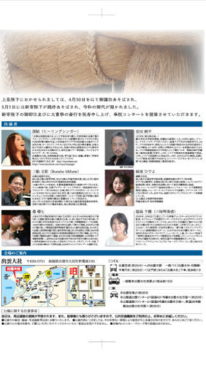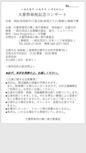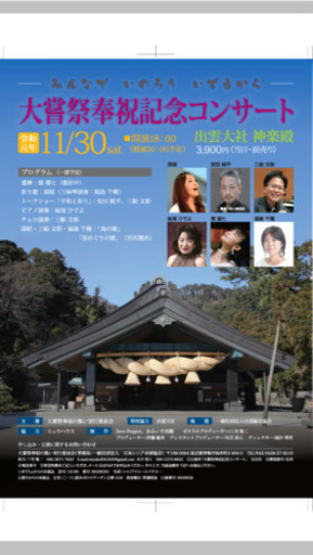 〜 みんなで いのろう いずもから 〜 大嘗祭奉祝記念コンサート開催日時: 2019年11月30日 18:00開演開催場所: 出雲大社 神楽殿(詳細) http://reiwa-izumo.com/主催: 大嘗祭奉祝の集い実行委員会 代表: 三宅 敬二 Tel: 0428-27-4519 mail: miyake830.830@gmail.com 担当:有吉 清人 mail:ariyoshi@win.email.ne.jp出演: 安田 純平、深結(ミュー)夫妻 倭 瑠七 (倭舞) 三船 文彰 (チェロ) 妹尾 ひでよ (ピアノ) 福島 千種 (三味琴)プログラム: 倭舞(1400年伝承) 祈り歌(深結:出雲観光大使、 島根県親善大使) トークショー「平和と祈り」 (シリアで拘束された安田氏) ピアノ演奏 チェロ演奏 チェロと三昧琴演奏: (世界初のコラボ)特別協力: 出雲大社後援: 一般社団法人 出雲観光協会(目的)新天皇が一生に一度だけ行う大嘗祭。新天皇が自身の再生新生を行うとともに国民の安寧と新生を祈られる最も重要な儀式を全国民と共に祝い、その奉祝の誠を神々に届けることを目的に奉祝記念コンサートを開催致します。縁結びの聖地「出雲大社」で沢山の方々と沢山のご縁を頂けるように全身全霊をかけて音楽を捧げたいと思います。