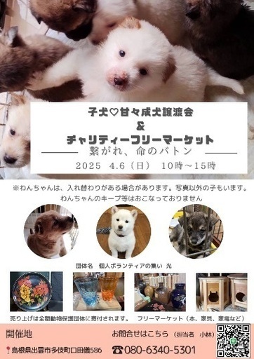 4月6日(日)10時〜15時出雲市田多技町口田儀586 古民家にて、甘々な成犬、子犬、成猫の譲渡会、チャリティーフリーマーケットを開催します!譲渡は無料ですが、予防接種済みの子は予防接種代を頂きます。譲渡書を書いて頂くのと免許書等の本人確認をおこないます🙂悪天結構、駐車場ありご質問等御座いましたら、お気軽にお問い合わせ下さい!