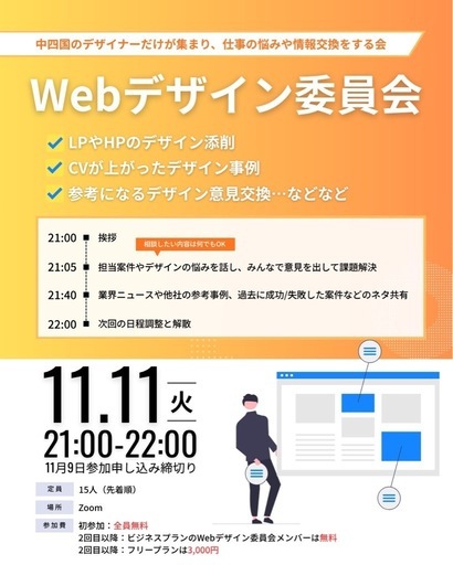 中四国のプロのデザイナーだけが集まり担当案件の悩みや情報交換するWebデザイン委員会を開催します🌈集まって話す内容は👇✅LPやHPのデザイン添削✅CVが上がったデザイン事例✅参考になるデザイン集など少人数でラフに楽しくしたいのでツール操作からマーケティングまで何でも話してOKです!笑…………………………………………………………………《開催日》11/11(火) 21:00〜22:00くらい※参加申し込み締切日は11/9まで《定員》15人《開催場所》Zoom(顔出し参加)《参加費》初参加の人は無料《詳細や申し込み》 https://s.lmes.jp/landing-qr/2006439228-oBz5G5DO?uLand=0lxnZQ…………………………………………………………………中四国最大級クリエイターコミュニティの中四国クリエイティブ学園です。当コミュニティでは、以下のことができます。🔸交流会やセミナー勉強会の参加🔸求人や仕事の募集し放題🔸イベントや事業の宣伝し放題🔸フリーランスや経営者の人脈拡大🔸オンライン朝活※MLMや宗教活動は禁止島根県にお住まいの方初参加の方は大歓迎です!皆さんの参加楽しみにしてます😊