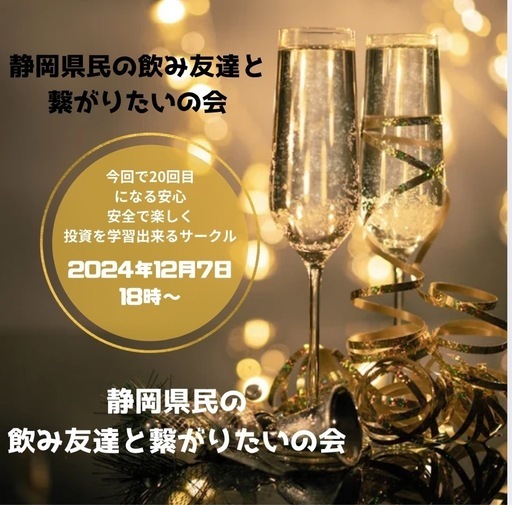 【静岡県民大忘年会】第21回静岡県の飲み友達と繋がりたいの会【ソフトドリンクのみもOK】昨年に引き続き☆静岡県民大忘年会☆を行います。浜松市で好立地かつ超オシャレな空間で楽しく忘年会 を過ごせるイベントになります。今回は2次会からも参加しやすい時間帯にしました。開催場所は浜松市有楽街周辺1次会 12月7日土曜日18時〜20時コース➕飲み放題 5000円(飲み放題内容)生ビール、ソムリエ厳選ワイン 赤白10種、焼酎、ハイボール、ソフトドリンク2次会は事前参加希望者のみ12月7日 20時15分〜会場の場所だけ予約。今年頑張ったこと、 来年やりたいこと皆さんで交流しながら楽しく1年を締め括りましょう!色んな人の話を聞いて、 新しい友達も作って来年も素晴らしい1年にする忘年会を実施します!社会人になるとライフステージの変化に伴い昔の友人と疎遠になったり気軽にお茶を飲んだり、飲みに行ったりする お友達やお知り合いが年々少なくなります。浜松で新しいお友達作りの交流できる場を作りたいと思って定期的に開催しています。【こんな人におすすめ】人と話して刺激をもらいたい方新しいお友達を作りたい人飲み友達を増やしたい!一緒に頑張る仲間を作りたい方老若男女誰でもご参加いただけます。お酒を飲めない人も大歓迎!■参加方法参加希望の方は、こちらに参加申請をお願いします。
