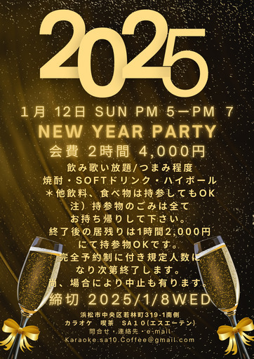 浜松市中央区若林町319-1南側カラオケ 喫茶 SA10(エスエーテン)です。連絡先 e-mail karaoke.SA10.coffee@gmail.com締切2025/1/8 水曜日