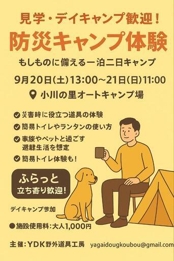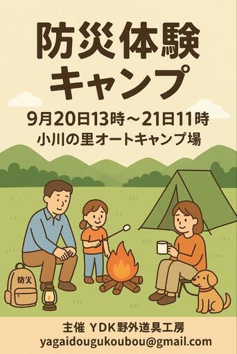 \見学・デイキャンプ参加OK!防災キャンプ体験イベント/⛺ もしもに備える一泊二日キャンプ📅 日時:9月20日(土)13:00~21日(日)11:00📍 場所:小川の里オートキャンプ場(浜松市天竜区)〒431-3752 静岡県浜松市天竜区小川1800キャンプで防災を学ぶイベントを開催!✅ 災害時に役立つ道具の体験✅ 簡易トイレやランタンの使い方✅ 家族やペットと過ごす避難生活を想定👀 見学のみでもOK!🌞 デイキャンプ参加も歓迎!(施設使用料:大人1,000円/子ども500円)ふらっと立ち寄って、リアルな防災体験をのぞいてみませんか?📩 主催:YDK野外道具工房📧 yagaidougukoubou@gmail.com