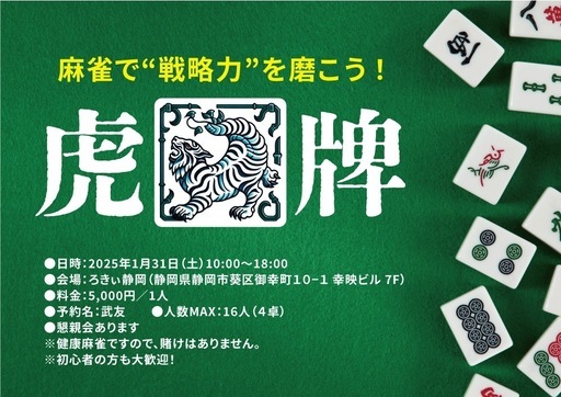 第四回虎牌🀄️1月31日(土)10:00〜18:00場所:ろきぃ静岡静岡県静岡市葵区御幸町10−1 幸映ビル 7F料金:5,000円/1人懇親会あります人数MAX:16名(4卓)※健康麻雀ですので、賭けはありません。※初心者の方も大歓迎!人数把握のため予約必須です▼ https://liff.line.me/1660832126-AZXnZ2je?liff_id=1660832126-AZXnZ2je&group_id=111035