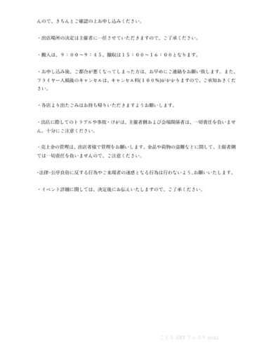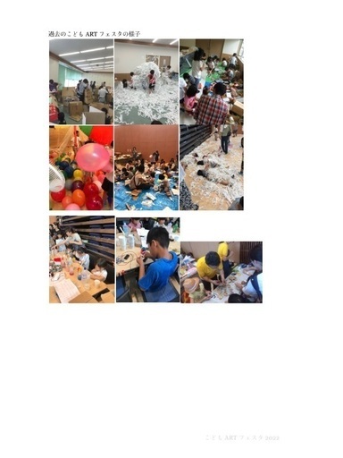こども向けアートイベント「こどもARTフェスタ」に出店していただけるフード出店者、ワークショップ出店者を募集いたします。「こどもARTフェスタ」とは、主催者である“そらいろ~こどものアトリエ~”の活動コンセプト「こどものやりたい放題を楽しもう」を根底に据え、こどもたちがなるべく何かに制約されることなく、思い切り楽しめる場と機会を提供することを目的とした、こどもが主役のアートイベントです。入場料を払い、トイレットペーパー遊びや自由工作などを楽しんだり、スライムづくりやボディペイント、スイーツデコなどのワークショップ(入場料とは別に要体験料)を体験することが出来ます。開催日時→2022年8月28日(日) 10:00〜15:00場所→御殿場市民交流センターふじざくら1F※屋内施設になります。出店料→2500円 (ワークショップは2000円)※1区画 2×2m出店資格→こどもARTフェスタの趣旨に賛同していただき、なるべく御殿場市近郊(静岡県東部)で活動・営業されている方。飲食店は、営業許可証を提出出来る方のみの出店になります。申し込み方法→店舗名(または活動名)、出店内容・料金、電話番号、メールアドレスを明記の上、sorairo.kodomo.no.atelier@gmail.com(植田)までお申し込みください。