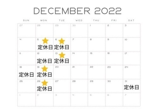 12月の定休日のお知らせ📢と‥12月は定休日特別営業致します定休日は一日二名限定!プラス髪質改善・酸性ストレート・ホイップストリートメントのメニューのみとなりますプラスカットも可能⭐️が付いてる日が定休日特別営業DAYとなります。ご予約はオーシャンインスタメッセージよりお問い合わせ下さい@ hairstage_ocean