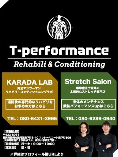 静岡市駿河区で リハビリ・コンディショニング専門サロン T-performance を運営している前田幸亮(まえだこうすけ)と申します。私は 理学療法士(国家資格) として病院やクリニックでの臨床経験を重ね、現在は地域の方に向けて「保険だけでは届かない部分をサポートする自費リハビリ・コンディショニング」を行っています。✅ 脳梗塞やパーキンソン病など神経疾患の方✅ 手術後の回復や運動再開を目指す方✅ 慢性的な腰痛・膝痛・肩の不調に悩む方✅ スポーツ復帰やパフォーマンスUPを目指す方一人ひとりの身体の状態を丁寧に評価し、「根本原因を見極めて整える」→「再発を防ぐ」→「より動ける体をつくる」というステップを大切にしています。🌿 60分〜120分のマンツーマン対応🌿 姿勢・歩行・動作分析をもとにしたオーダーメイドプラン🌿 栄養・自律神経ケアとの組み合わせで総合的にサポート「もっと良くなりたい」「病院を卒業した後のリハビリ環境がほしい」「競技や趣味を全力で楽しみたい」そんな方の力になれれば嬉しいです。📍 JR静岡駅から徒歩7分ホームページ: https://t-performance.com公式LINE: https://lin.ee/9T9FM2dまずはお気軽にご相談ください。