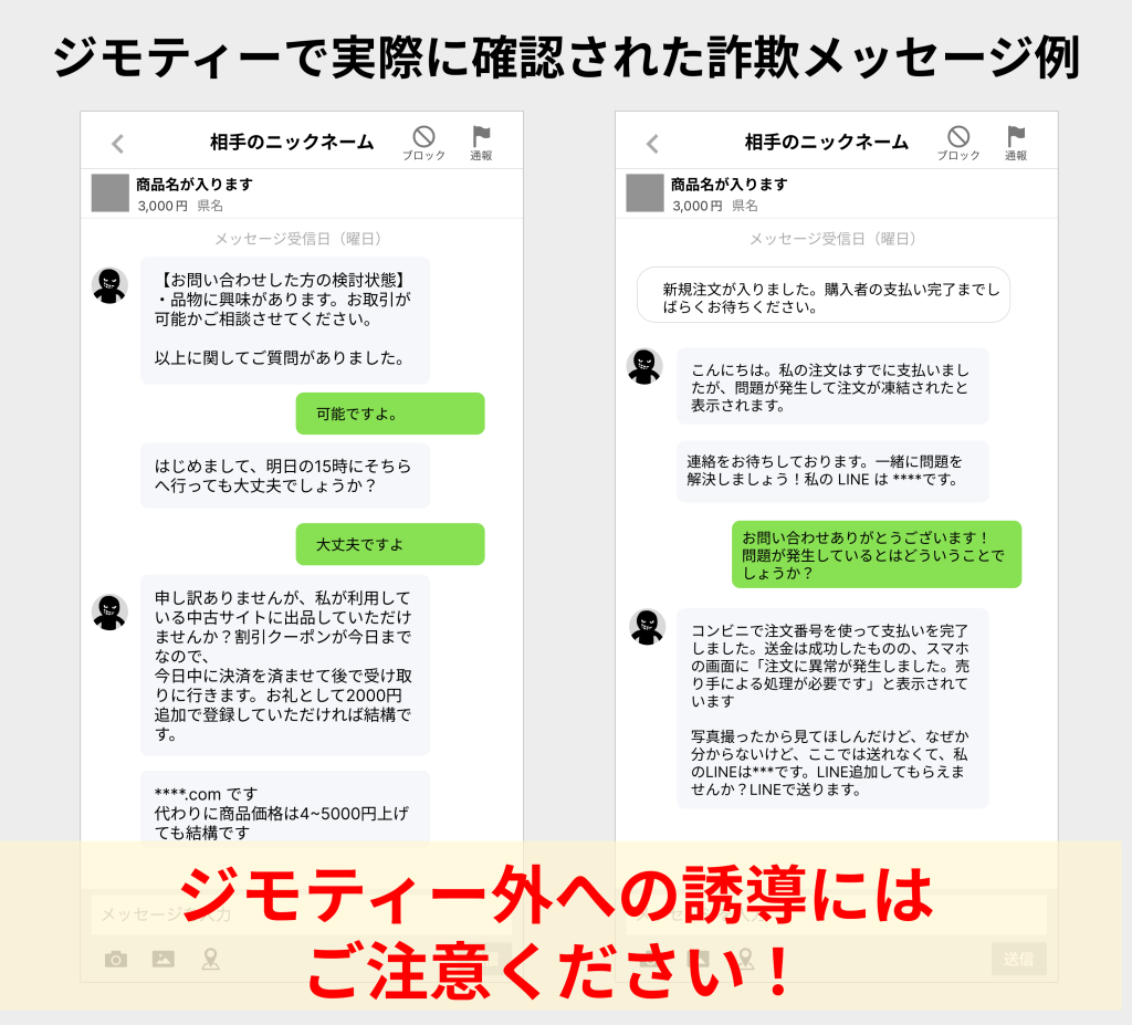 ジモティーでは詐欺を防ぐため、外部でのやりとり/外部の決済手段の利用を禁止しています。様々な方法でジモティー外部に誘導しようとする不審なユーザーやリンクを見かけたら、やり取り内の通報ボタンよりご連絡ください。