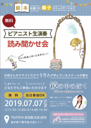 マザーズコーチングスクールの代表が子育てで一番大事なモノガタリとして、描いた絵本『鏡の中のぼく』の書店イベントが栃木県で初開催されます♫素敵なピアノ生演奏を聴きながら、親子で一緒に絵本イベントを楽しんでみませんか?▶︎7月7日(日)▶︎1回目 11:30-12:00 2回目 14:00-14:30▶︎TSUTAYA自治医大店 店内▶︎参加無料お問合せ&参加申込みLINE@tkt1809e(@を含めて検索下さい)mail:m1108y0206@i.softbank.jp参加申込みの方はお名前参加時間 ①or②をお願い致します。アメブロameblo.jp/mika1108t母親が我が子のために学ぶマザーズコーチングスクール https://motherscoachingschool.com/全国の書店イベント一覧 http://kagaminonakanoboku.com/eventmap/鏡の中のぼく https://giftbooks.shop/動画配信 https://youtu.be/kIL0ePsLqLc