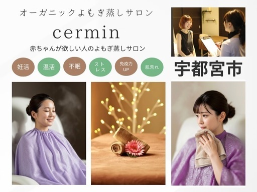 🍀妊活・温活中のあなたへ\人生経験豊富なオーナーが寄り添う、隠れ家オーガニックよもぎ蒸しサロン/冷えやすい体質、妊活中の不安、なんとなく続く不調……そんな女性の「ちょっとした不安」に、よもぎ蒸しでやさしく寄り添います。🌿完全予約制・隠れ家のようなプライベート空間🌿妊活・温活・PMSや更年期のケアに🌿人生経験豊富なオーナーが、体だけでなく心にもアプローチ🌿「妊娠しました!」の喜びの声も多数✨「誰にも言えない悩みがある」「病院と合わせて自分でもできることを始めたい」「年齢を言い訳にしたくない」「代謝を上げたい」「お肌を綺麗にしたい」 「体には自然のものを使いたい」そんなあなたの味方になる、あたたかい場所です。エイジングケアのフェイシャルエステも大好評!まずは一度お試しください。お気軽にどうぞ☺️◾️メニュー(プリンセスor黄土のお椅子が選べます)・よもぎ蒸し…60分4,200円・よもぎ蒸し…45分3,700円 ※ペアの方は500円オフ◾️エイジングケア フェイシャルエステ (約70分) よもぎ蒸しと同日施術で4,000円フェイシャルのみは5,000円・毛穴キレイ!炭酸パックコース・持ち上がる!ヒト幹細胞コース◾️アロマオイルトリートメント10分1,000円〜 不定休平日(月〜金) 19:30〜20:30(入店時間)土日祝 10:00〜20:30(入店時間)女性限定・完全予約制ご予約は下記のいずれかの方法でメール→ cermin.gold@gmail.com公式LINE→ @krh1701dHPから→ https://miya-man.com/beauty/cermin/お電話→070-4037-0852お電話は出られないことが多いです