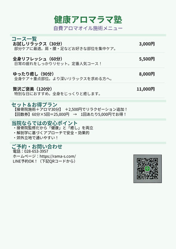 🌿 接骨院発!健康アロマラマ塾 🌿自費アロマオイル施術メニュー🕒 コース一覧🍀 お試しリラックスコース(30分) 部分ケアに最適。肩・腰・足などお好きな部位を集中ケア。 👉 3,000円🌸 全身リフレッシュコース(60分) 日常の疲れをしっかりリセット。定番人気コース! 👉 5,500円🌙 ゆったり癒しコース(90分) 全身ケア+重点部位。より深いリラックスを求める方へ。 👉 8,000円💎 贅沢ご褒美コース(120分) 特別な日におすすめ。全身をじっくりと癒します。 👉 11,000円🎁 セット&お得プラン【接骨院施術+アロマ30分】 👉 +2,500円でリラクゼーション追加!【回数券】60分×5回=25,000円 👉 1回あたり5,000円でお得!🏥 当院ならではの安心ポイント接骨院監修だから「健康」と「癒し」を両立プロの解剖学的アプローチで安全・効果的郊外立地で通いやすい!