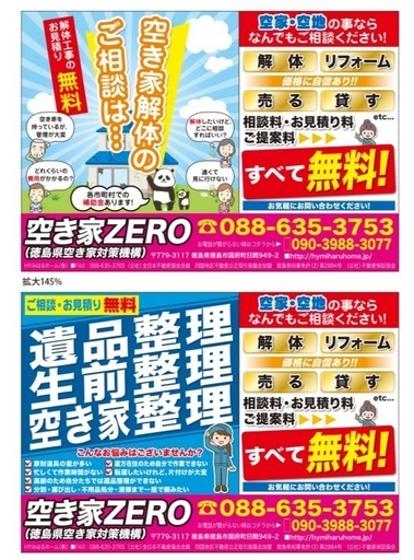 空き家、空き地のお持ちの方に朗報!ご相談承ります。相談料無料!当方、宅建士、空き家コーディネーターの資格有り。売買、賃貸、譲渡、買い取り解体、リフォーム、遺品整理、空き家、空き地についてのお困り事を相談から解決までお引き受けいたします。どのような空き家、空き地でも当方お断りはいたしません。各県、市町村の条例、補助金等の相談も相続、贈与、各税金、手続きのご相談も承ります。絶対にお断りいたしません。相談料、査定料、一切無料でさせていただきます。秘密厳守お問い合わせは空き家ZERO088-635-3753090-3988-3007よろしくお願いします。