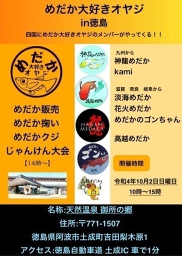 この度は高越めだかの掲載を見て頂きありがとうございます。 今年に入りまして高越めだかは県内外で多数のイベントをさせて頂いております。今回は徳島県で初の めだか大好きオヤジ イベントを開催させていただきます!高越めだかもメンバーの【めだか大好きオヤジ】メンバーがなんと徳島県に集まります!九州地方からは神龍めだかさんと絵で有名なkamiさん本州からは淡海めだかさん・花火めだかさんめだかのゴンちゃん(GSKめだかさん)が一度に徳島県に集まりイベントを開催することになりました!普段は九州や関西の方の方達なのでなかなかメダカの即売会に参加する事が出来ないと思いますので是非遊びに来て頂けたらと思います!めだか販売の他にもめだかすくいめだかクジ普段徳島のイベントではなかなかする事の出来ないジャンケン大会(14時から)も開催されます!皆さん良いメダカや珍しいメダカをお持ちの方ばかりですので凄く楽しめるイベントかと思います!普段徳島県でイベントをさせて頂いている時県外から来て頂ける方も結構います今回は県外からの方もお越し頂けやすいようにと思いまして徳島県阿波市土成町にある【天然温泉 御所の郷】をお借りしてのイベントとなります。土成ICを降りて頂きおよそ車で1分の所になります。アクセスもよく駐車場広く凄く良い会場となっております!是非お越し頂けたらと思います。【SNS】高越めだかではジモティー以外にもTwitter・Instagram・LINEでご連絡などを受付しております。気になる事などがありましたら各SNSでお問い合わせ下さい。※できるだけ早く対応出来るようには頑張りますが直ぐには対応出来ない場合もあります。ご了承ください。○お問い合わせは遠慮なくお気軽にお願いします。Twitter・Instagramは高越めだかと検索して頂ければ出てきます。LINEはQRコードを載せておきましたのでお気軽にメッセージお願いします。【出店者情報】福岡県:神龍めだか福岡県:kami滋賀県:淡海めだか奈良県:花火めだか岐阜県:めだかのゴンちゃん(GSKめだか)徳島県:高越めだか【開催情報】名称: 天然温泉御所の郷住所: 〒771-1507 徳島県阿波市土成町吉田梨木原1開催時間: 10:00~16:00イベント参加日: 10月2日主催: めだか大好きオヤジイベントページ: 高越めだか