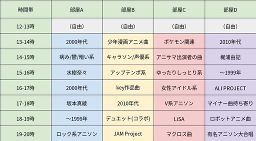 アニソンオフ会を開催します!参加者募集中🎶画像の通り、一部の部屋がテーマ部屋となります!テーマのないアニソン全般部屋も多いので好きなアニソンをぜひ🎶途中参加や途中退出も自由🙋♀️時間長いので、好きな時間にどうぞ!ジモティーでの参加条件外の方は、参加者からの紹介制となります🙏マイナー曲でも古い曲でも大歓迎✨アニメはあまり見ないけどアニソンが好きという方もぜひ!(幹事もそんな感じ)【日程】9/7(日)12〜20時※途中参加・途中退出可!【カラオケの場所】神田付近のカラオケ店※場所は参加者のみにご案内します【参加費】1800円以内で調整中※ソフトドリンクバー付き🍹※支払いは、現金・ PayPay可【人数】合計50名程度を想定!前回55名!【年齢層】20〜30代が多いです!40代もいます!【開催イメージ】●アニメやアニソンを少しでも好きなら歓迎●好きな作品が少ない人も歓迎●日頃歌いにくいマニアックな曲も歓迎●歌えるアニソンが少ない人は、アニソン以外の歌唱可●アニソン年代別やジャンル別のガチ部屋も一部あり(画像参照)【一部の部屋のテーマ(時限式) ※テーマのないアニソン全般部屋も沢山あります】水樹奈々、梶浦由記、ALI PROJECT、LiSA、坂本真綾、マクロス、ロボットアニメ、〜1999年、2000〜2009年、2010〜2019年、アニソンロック、V系アニソン、キャラソン、声優、デュエット、アニサマ出演アーティスト、JAM Project、女性アイドルアニメ、少年漫画系、暗い系、ゆったり系、ポケモン、key作品曲、有名アニソン合唱、マイナー曲など【注意事項】●当日や後日の勧誘(宗教、ネットワークビジネス、合コン、営利目的の飲み会イベントなど)は「禁止」!発覚次第出禁で、全体に名指しで注意喚起します!●他の参加者の歌を聞くことも好きな方限定●他の人が歌ってる時に、スマホ等で曲を聞かない。ゲームをしない●他の参加者とコミュニケーションを取る気がない方はご遠慮ください【カラオケ会での禁止事項】●参加者の歌に対する批判的態度/発言●1人が曲を連続で入れる/意図的な順番抜かし●歌っている人の邪魔●参加者が歌っている時に大声で話し続ける●カラオケ当日や後日の各種勧誘行為●ハモりが苦手な人へのハモり●参加者に年齢住所 個人情報を執拗に聞く●参加者に対する失礼な発言●絡みが少ないのにいきなり連絡先を聞く等の行為★★★参加希望の方は、メッセージで以下の記載をお願いします!(記載内容:参加の時間帯、好きなアニソンや歌手)★★★