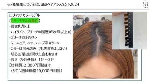 はじめまして!!六本木、広尾ukaという美容室のアシスタントをしております!!吉田咲希(よしださき)と申します。 ただ今、アシスタントカリキュラム練習で リタッチカラーモデルを募集しています。 サロンでの営業でなく、練習モデルとなりますのでご了承ください。 日時⬇️※当日予約OK※5/24(金)12:00~ 所要時間…2~3時間 場所…ukademylive練習スタジオ 〒106-0031 東京都港区西麻布1-8-7綿工連会館1F 料金…材料費として、2000円頂きます。 ※29日のみ場所が変わりますのでご注意ください。(ウェラスタジオ東京) モデル条件 ・女性 ・根元が1cm〜3cm伸びている ・白髪染め× ・リタッチ幅1~3cm ・明度6~12lvまで ・ブリーチリタッチ不可 ・ハイライト、ブリーチ履歴6ヶ月以上前ならok ・レングスボブ以上 ・ヘナ、マニキュアではありません (不安な方は、写真をいただきたいです。) ・毛先までのカラーは今回は行っておりません。 実際のサロンでも使用しているトリートメントと簡単なブローも一緒にさせて頂きます。 ※当日予約の場合全ての施術が出来ない可能性がございます何卒ご理解のほどよろしくお願いします。 ※店舗や、オフィスへ連絡されてもご返答ができません。 質問や、時間変更、キャンセル等は直接ジモティー上にて、ご連絡ください。 ※店舗ではなく、練習スタジオとなっております。 ※先輩の指導の下、練習モデルになりますので、条件に合わない方はお断りする場合がございます。 ※ご予約の時間に遅れた場合、施術対応ができない場合がございます。 ※消毒、検温、同意施術書のご協力をお願いしております。ご興味のある方、お気軽にDM等お待ちしております!