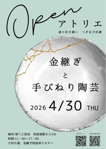 2026.4.30 THU 【金継ぎ と 手びねり陶芸】1DAY Openアトリエすることにしました。場所は西荻窪北口神明通りの 栗八工房舎さん金継ぎ作業をして展示、受け渡し母の手びねり陶器の展示ものにより販売金継ぎ相談も承ります。普段あまり見ることのない普段使いの金継ぎや途中工程のものも展示予定まだまだ経験を積んでいきたい修行中ですので応援していただけると嬉しいです。ゴールデンウィーク始まりの平日はじめてのOpenアトリエなのでコーヒーを飲みながら作業をしてのんびり小さくはじめますのでご近所さん、金継ぎや陶器に興味のある方ごゆるりとお散歩がてらお寄りください。2026.4.30(木) 11:00~17:00【金継ぎ と 手びねり陶芸】1DAY Openアトリエ場所:栗八工房舎東京都杉並区西荻北3丁目7−8西荻窪駅」北口より徒歩5分駅北口より、高架下の西友を抜けて直ぐ。#金継ぎアトリエ#金継ぎ相談#金継ぎ工房#手びねり陶器#西荻窪金継ぎ
