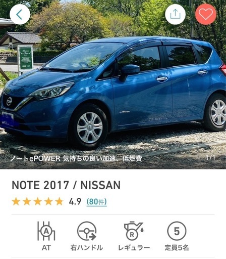 Anyca エニカオーナーで貸出をしていました。スタッドレス履き替えました。4月まで予約は一週間前までに使用が決まっている日4月28日〜29日使用料は5,000円 /24hです。初回に限り7,000円/24hになります。paypay払い可能です。ガソリンは満タン返しでお願いいたします。ノートe-POWERは、100%電気自動車のため、エンジンの動力はバッテリーの充電にのみ影響します。よろしくお願いいたします詳細ご希望の方は事前に、ご質問をお願いいたします。■ 特徴や魅力の詳細はじめまして!ご覧いただきありがとうございます。アウトドアや旅行にもおすすめの5人乗りです!2駆にも関わらず雪上走行も推しているe-POWERですが走り方にや雪の状況によっては滑りますのでお気をつけください。事故に関してのタイヤの責任は負いかねますのでよろしくお願いいたします。大人用スキー板やスノーボード子ども用スキー板やスノーボードブーツもサイズが合えばレンタルいたします。お問い合わせください。▼低燃費ガソリンで走る電気自動車のため長距離のドライブにも)おすすめです!(これまでの私の運転で平均20km/L下回ったことはありません)▼クルマの魅力燃費が良いのに、電気自動車ならではのパワフルな走りにワンペダル最高です。ワンペダルなのでアクセルを離すとブレーキがかかります。とても心地良いブレーキングです。普通の仕様にも変更可能です。クルマのグレードはXグレードです。社外品ナビ付きテレビも見れます運転中はお気をつけてご利用ください。携帯充電用にUSB使用可能です。ライトニング2本USB-c1本microusb1本お互い気持ちよくシェアできるよう、しっかりご対応させていただきます。■ カーシェアにおける注意点お渡し時に初めての方は、免許証の内容をメモさせていただきます。ご返却時に車体の傷を確認いたします。現状復帰にご協力お願いいたします。保険加入にご協力お願いいたします。クルマに関してのご質問や、お待ち合わせ場所のご相談など、お気軽にお問い合わせください。▪️ キャンセル料受け渡し時間の24h以内で50%当日は100%いただきます。▪️保険一日保険をご利用であれば、そのスクショをお送りいただくか当日お見せください。▪️受け渡しについて原則は武蔵野音楽大学近くの駐車場にての受け渡しになりますが、江古田、新江古田、小竹向原、池袋、練馬、中野、東中野などが可能です。お時間など調整させてください。交通費の二倍を手数料としていただきます。時間は、24h設定にしていますが夜中の受け渡しなどは難しいので、前日に鍵をお渡しすることなども検討させていただきます。お渡しする時に、お貸しする車の傷確認と免許証確認をさせていただきたいと思います。車はすでに小さな傷はあるので似たような傷であれば対象外の場合もありますが傷を付けてしまった場合は、必ずご申告をお願いいたします。保険適用にならない場合にも、現状復帰をお願いいたします。ご不明な点がございましたらお気軽にお問い合わせください。リピートしていただければ受け渡しが簡単になると思いますのでご検討ください。日程の変更や、キャンセルが決定した段階で早めにご連絡ください。よろしくお願いいたします🙇♂️