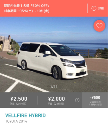ヴェルファイアを貸します。1日9000円+保険平日は8000円+保険です。レンタカーの半額以下の値段です。