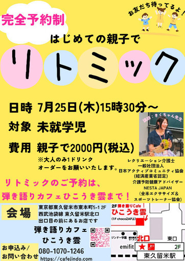 〜はじめての親子でリトミック 第2回〜🟣7月25日(木曜日) 15時30分〜🟣弾き語りカフェ☕️ひこうき雲☁️ 東京都東久留米市東本町5-1 2F @hikigataricafehikoukigumo 西武池袋線東久留米駅より徒歩3分程です🥰💖🟣親子で2000円(税込) ※大人のみ1ドリンクオーダーを よろしくお願い致します🙇♀️🟣対象年齢 未就学児を対象としており、 0歳(ハイハイをしているお子様でもOK🙆♀️)から 対象としております。 第1回目から参加者には、 大好評をいただいております😊🙏🩷🟣完全予約制 ご予約必須のイベントのため、 参加希望の方は 弾き語りカフェ☕️ひこうき雲☁️ オーナー えみちゃん(08010701246)まで 下記内容と共にご連絡くださいませ! ・参加人数 ・お子さまの年齢(◯歳何ヶ月) ———————————————はじめまして!レクリエーション介護士(経済産業省認定)兼健康アドバイザーNESTA JAPAN(全米エクササイズ&スポーツトレーナー協会)のきく🧸と申します😊!スポーツトレーニングの資格NESTA JAPAN(全米エクササイズ&スポーツトレーナー協会)の公式資格も取得し、音楽と体操トレーニングを使用した頭と身体を使うお子さまへのリトミック講座を東京都東久留米市にある「弾き語りカフェ☕️ひこうき雲☁️」様で開催する事になりました。親子で参加出来るイベントで、音楽や体操トレーニングを始めたことが無い方でも安心してご参加いただけます☺️!出来るだけ沢山の方にご参加いただきたく、非常にリーズナブルな料金設定にしております。お店にはグランドピアノ🎹があり、オーナー(えみちゃん)も一緒に参加くださるため素敵な音色をお子さまと楽しんでいただきながら有意義な時間を過ごしていただけます。音楽に触れたことがなくても大丈夫です👍是非、お気軽にご参加くださいませ😊🎵