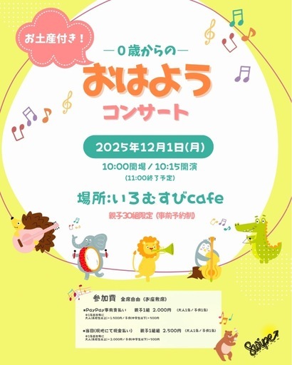小さなお子さまやママに生演奏を届けたい💌0歳から楽しめる気軽なコンサートを通じて、ママたちが笑顔になる場所をもっと増やしたい‼️この思いが形となり、実現する運びとなりました☺️クラリネットやピアノ、パーカッション…毎月ちがった音楽を楽しめる「おはようコンサート☀️」12月1日(月)は2本のクラリネットとパーカッションによる演奏です🥁🎶クリスマス・ソングや冬の童謡はもちろんのこと、クリスマス仕様の手作り楽器を皆で作って合奏をします!私達はお子さまが思っきり楽しんで、ママ同士の交流ができる温かい空間作りを心がけています。どうぞ安心してご参加ください😊╭━━━━━━━━━━━━━━━━╮ お子様のコンサートデビューに🥁✨️╰━v━━━━━━━━━━━━━━╯コンサートへ行きたいけど、演奏中に静かにじっとしてるのが難しい…なんて全く心配はいりません‼️演奏中泣いてしまっても大丈夫☺️もちろん演奏中のオムツ替えもOKです👍会場内には授乳室もございます🍼演奏会場は「コトニア赤羽」𝟏階にお店を構えるいろむすび𝐜𝐚𝐟𝐞☕️ママ自身が「子連れで気軽におでかけできて、居心地のいい場所が作りたい」という想いで運営しているカフェです。コンサートは靴を脱いでくつろげる「座卓スペース」にて行います。首の座っていない赤ちゃんもゴロゴロ寝転がりながら、椅子から落ちる心配もなく安心して一緒に楽しむことができます☺️周りを気にすることなく気軽に参加出来ますので、お子さまのコンサートデビューに最適ですよ✨【~0歳からの~おはようコンサート☀️】◾︎開催日 2025年12月1日(月)◾︎時間 10:00開場/10:15開演(11:00終了予定)◾︎会場 いろむすびcafe📍東京都北区中十条4-17-1コトニア赤羽1階(赤羽駅南改札口から徒歩10分)◾︎参加人数 親子30組さま限定‼️◾︎対象0歳以上のお子さまとご家族(産前のママさんもどうぞ☺️)◾︎参加者特典お子さまにお土産が付きます🍬🍿◾︎参加費・PayPay事前決済親子1組(大人1人/子供1人) 2,000円※1名追加毎に大人(高校生以上)+1,500円子供(中学生以下)+500円・当日現地にて現金払い親子1組(大人1人/子供1人) 2,500円※1名追加毎に大人(高校生以上)+2,000円子供(中学生以下)+500円◾︎お申込 https://docs.google.com/forms/d/194gmVZNqZIdJBd-4TS4genQVLVAV_vkRuypIplA3kMc/viewform?edit_requested=trueまたはQRコードからお申込フォームへアクセス📱お申込フォームへ必要事項をご入力の上、お申込をお願いいたします。/小さなおともだちのみんな‼️一緒に楽しもうね✨\