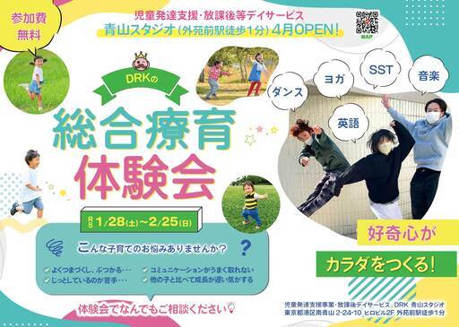 DRK(デジタル療育研究所)に所属している児童指導員、理学療法士、公認心理師、芸術療法士やダンサーやヨガインストラクターなどの表現活動をされている先生方と楽しくカラダを動かして遊ぼう!✨DRKの総合療育×体験会では、【ダンス・ヨガ】などの運動や体幹強化に特化した支援から【音楽・英語】などのSSTの発達を促す内容まで各専門家達が楽しくできた!の体験を支援していきます!✨ーーーーーーーーーーーーーーーーーーーーーーーーーーーーーーーーーーこんな子育てのお悩みありませんか?・よくつまづくし、ぶつかってしまう・コミュニケーションがうまく取れない・ジッとしているのが苦手・ほかの子と比べて成長が遅い気がする・・・・DRK所属のスタッフがお悩み相談させていただきます!なんでも体験会でご相談ください!✨また、体験会は複数回参加可能ですので、他日程もぜひご参加ください!****************************「DRKの総合療育×体験会」✨~好奇心がカラダをつくる~「音楽療法」日時:2/4(土)①10:00~11:00会場:スタジオIrodori麻布十番住所:港区麻布十番1-5-1 麻布十番YKビル3F申し込み方法:①予約サイト https://select-type.com/rsv/?id=VczKvdu81KU&c_id=264506②メールdejitaruryouiku1128@gmail.com③お電話(090)1138-0031まで・お子様のお名前・保護者様のお名前・連絡のつくお電話番号(必須)・メールアドレス(必須)・ご希望の体験日時をご準備してご連絡ください。お待ちしています!✨****************************↓その他体験療育日時と内容↓1/28(土)「親子でヨガ」①9:30~10:30 ②10:45~11:452/1(水)「英語でダンス」①15:00~16:00 ②16:15~17:152/4(土)「音楽療法」①10:00~11:00 ②11:15~12:152/8(水)「英語でダンス」①15:00~16:00 ②16:15~17:152/11(土)「親子でヨガ」①10:00~11:00 ②11:15~12:152/15(水)「音楽療法」①15:00~16:00 ②16:15~17:152/18(土)「英語でダンス」①10:00~11:00 ② 11:15~12:152/22(水)「英語でダンス」①15:00 ~16:00 ②16:15~17:152/25(土)「親子でヨガ」①10:00~11:00 ②11: 15~12:15専門的な指導を受けたスペシャルな先生たちと楽しくできた!を作っていきましょう!****************************DRK青山スタジオ〒107-0062東京都港区南青山2-24-10 ヒロビルディング2階dejitaruryouiku1128@gmail.com(090)1138-0031 担当:伊藤****************************