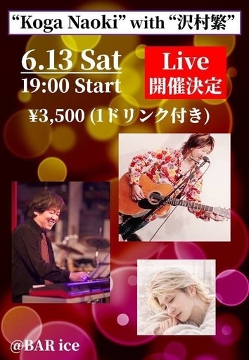 🌙✨ SPECIAL NIGHT ライブ✨🌙Koga Naoki大阪生まれ、長崎県出身。🇰🇷×🇯🇵のシンガーソングライター。TBS全国番組にて林家三平氏の実家を取材。故郷・長崎フォトコンテスト「あなたのいちばん大切な場所」入賞。福山雅治フォトコンテスト入賞。DEEN元メンバーによる作品も発表。「何も話さず海を見よう」リリース。2023.3.15(Being)「リリアーナ」「君だけの桜色」2024.12.11(B ZONE)「キミのHorizon」「ばぁちゃんの子守唄」「좋아해요」俳優としても舞台に立つ。新宿シアターモリエール、渋谷クロスタワーホール、ヤクルトホール、池袋小劇場ほか出演。Koga Naoki__________🌙✨GUEST ✨🌙🎹 沢村 繁 🎹静寂に溶けるような繊細さと、 夜を熱く染める情熱のグルーヴ——クラシックとJAZZを自在に行き来するピアニスト。 17歳でジャズに出会い、 市川秀男、佐藤允彦に師事。日野元彦、小松亮太、納浩一 ほか 一流ミュージシャンと多数共演。🎼 AGIレーベル主宰 『REMEMBER OF WOODS』 『ORGANIC JAZZ』 『AIR Groove Jazz』さらに、クレイジーケンバンドメンバーとの共演も。───────────────📅 6/13(土) ⏰ 19:00〜20:00💰 3500円(1ドリンク付き)ドリンク2杯目より、フード別料金他、投げ銭スタイル(1000円から)CD販売あり(サイン入り)場所 BAR ice 小岩駅南口中央通り東京都江戸川区南小岩7-28-11ファーストセントラルビル地下1階奥───────────────🌃 グラスを傾けながら、 音に酔う特別な夜をご一緒にすごしませんか——お気軽にご連絡くださいお待ちしてます